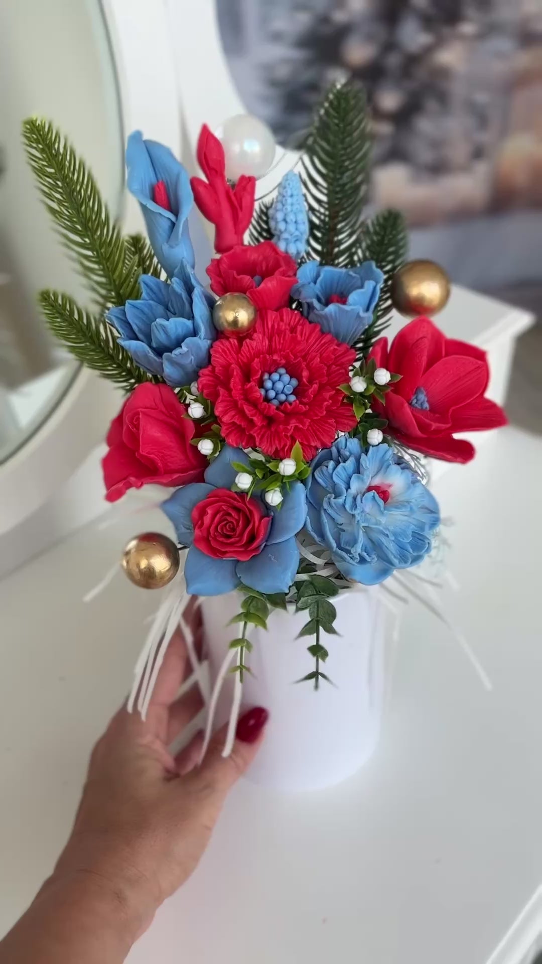 Ein eleganter Seifenblumenstrauß aus 15 handgefertigten Blüten. Leuchtende Kontraste von Rot und Blau, inspiriert vom Tanz des Nordlichts am Winterhimmel.